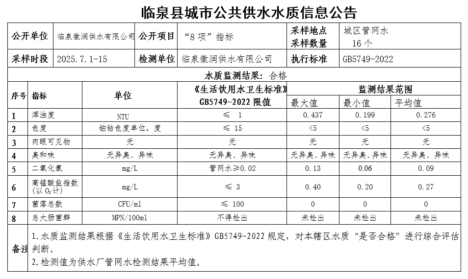 下一条: 临泉县城市公共供水水质信息公告2025年7月7日至2025年7月13日(9项)