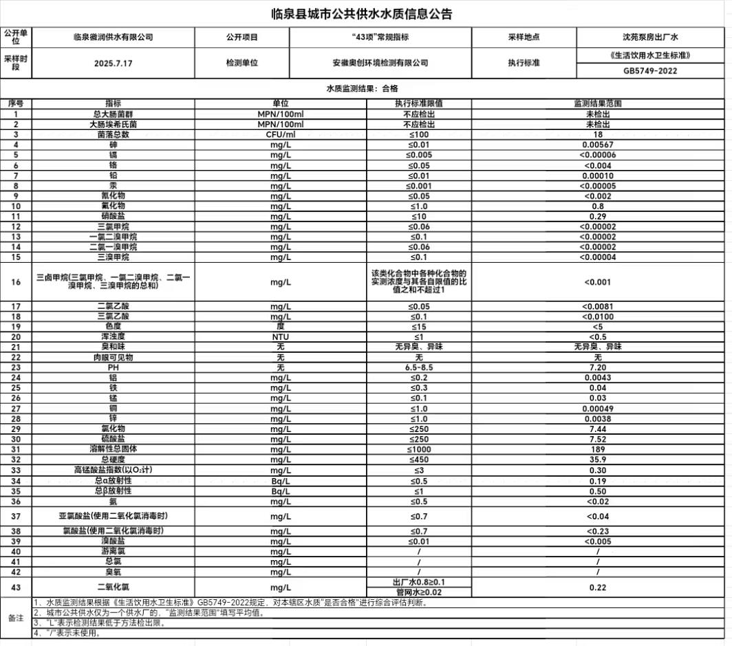 上一条: 2025年度临泉县城市公共供水水质信息公告(97项全分析)