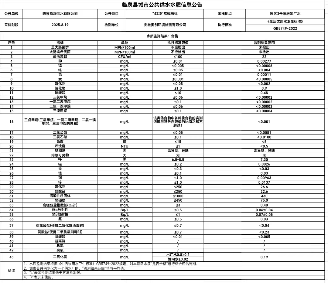 上一条: 临泉县城市公共供水水质信息公告2025年9月(43项)
