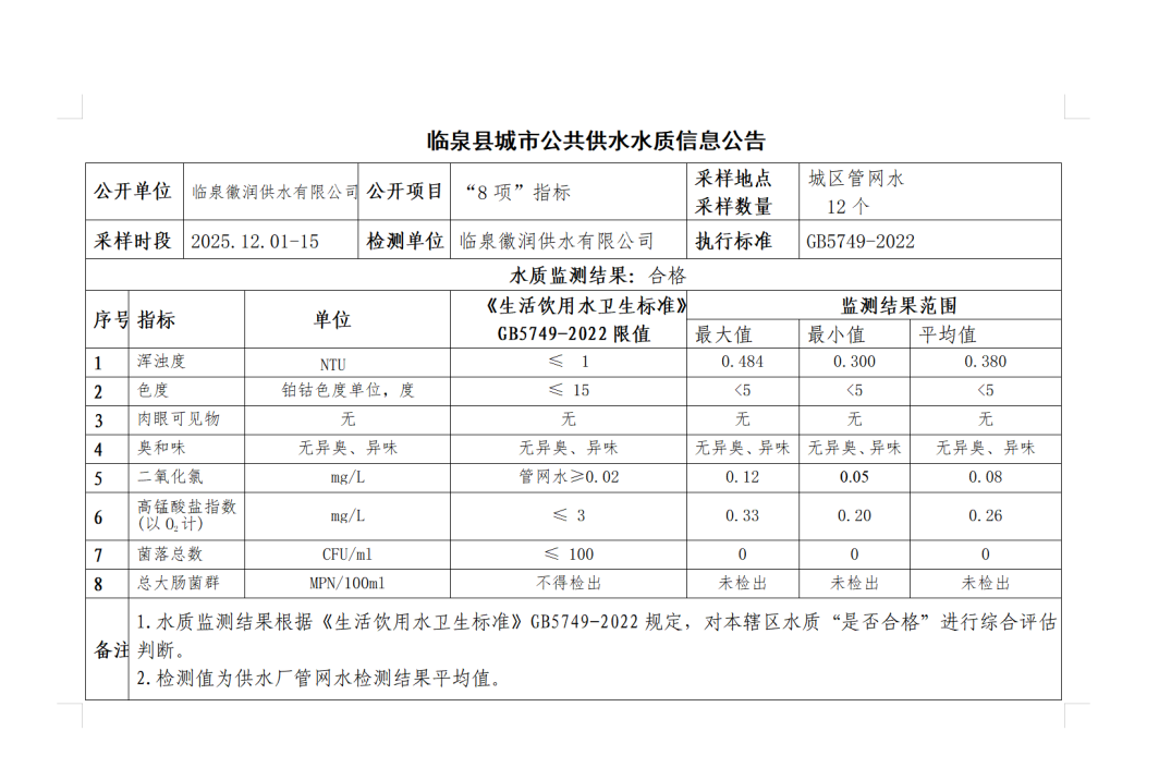 上一条: 临泉县城市公共供水水质信息公告2025年12月(43项)