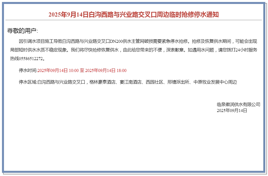上一条: 2025年9月20日抢修临时停水通知