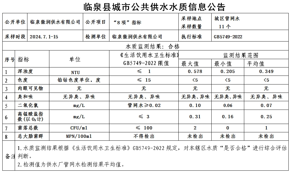 下一条: 临泉县城市公共供水水质信息公告2024年7月8日至2024年7月14日(9项)