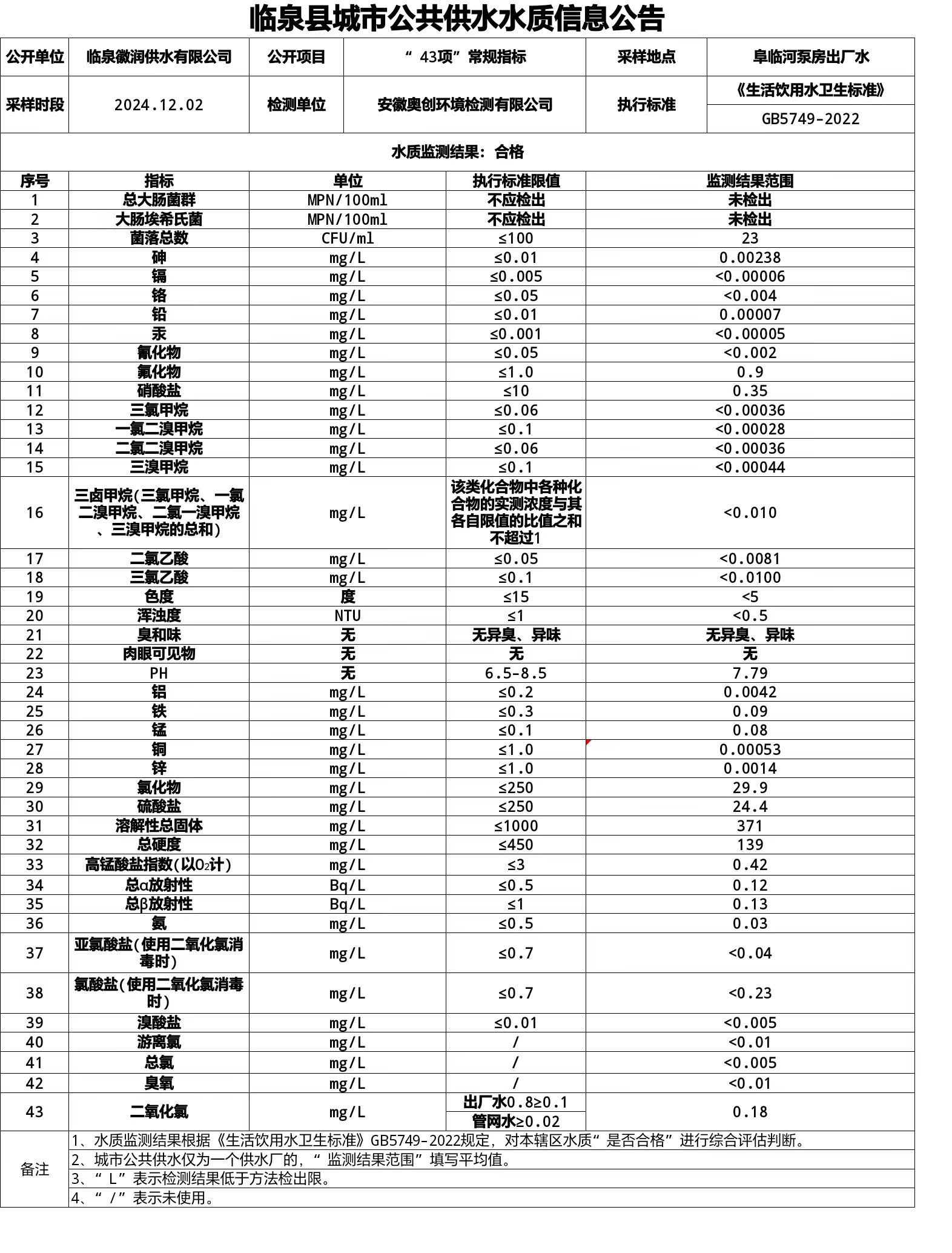 下一条: 临泉县城市公共供水水质信息公告2024年12月16日至2024年12月22日(9项)