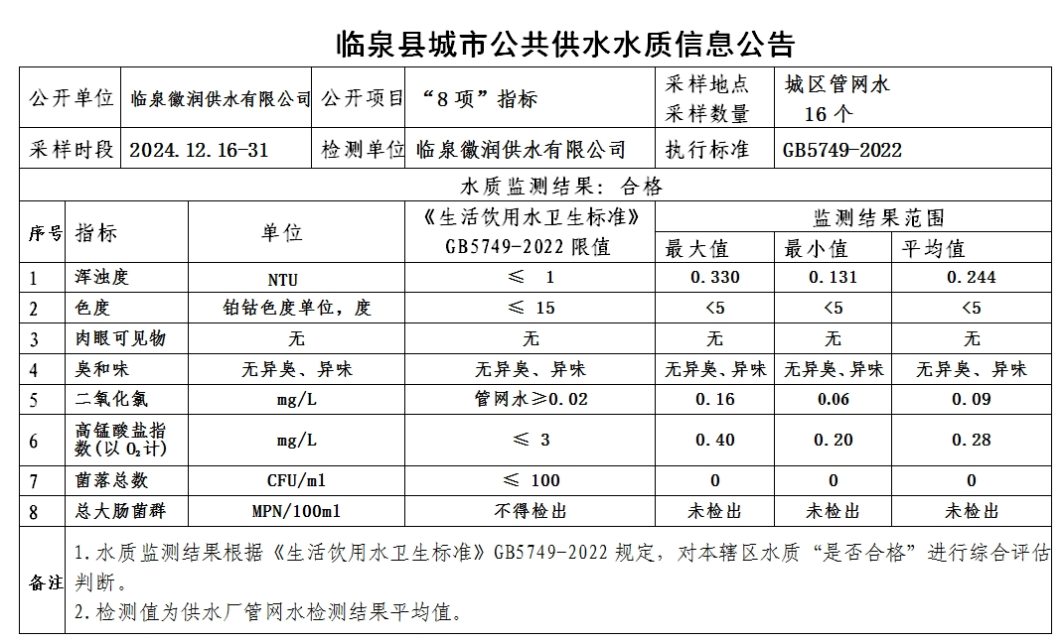 下一条: 临泉县城市公共供水水质信息公告2024年12月(43项)