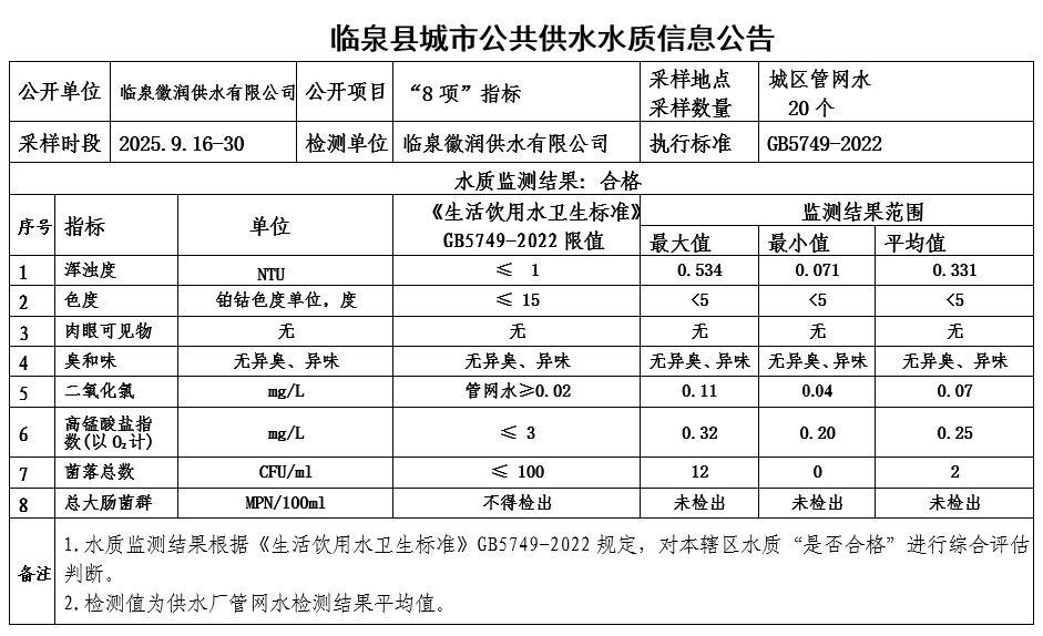 上一条: 临泉县城市公共供水水质信息公告2025年9月29日至2025年10月5日(9项)