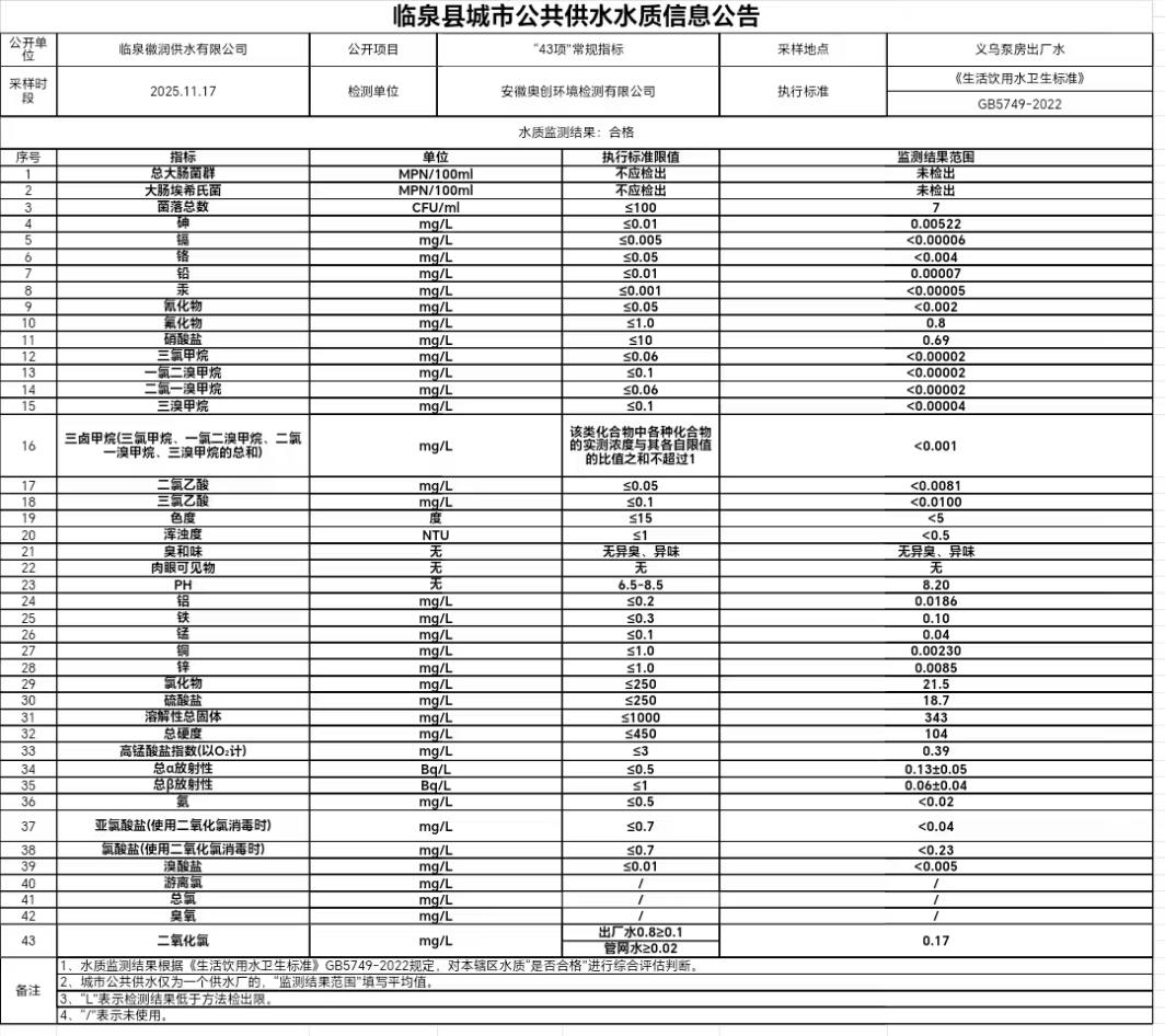 上一条: 临泉县城市公共供水水质信息公告2025年12月1日至2025年12月7日(9项)