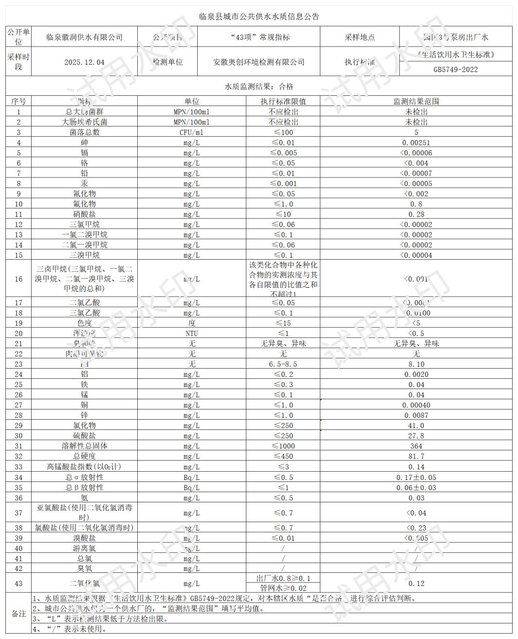 下一条: 临泉县城市公共供水水质信息公告2025年12月上半月(8项)