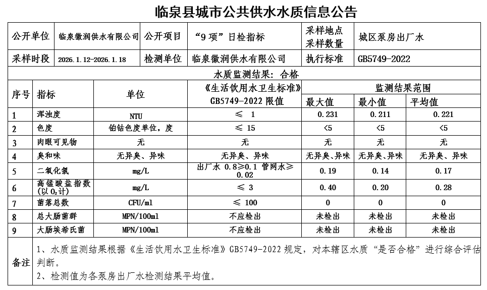 上一条: 临泉县城市公共供水水质信息公告2026年1月(43项)