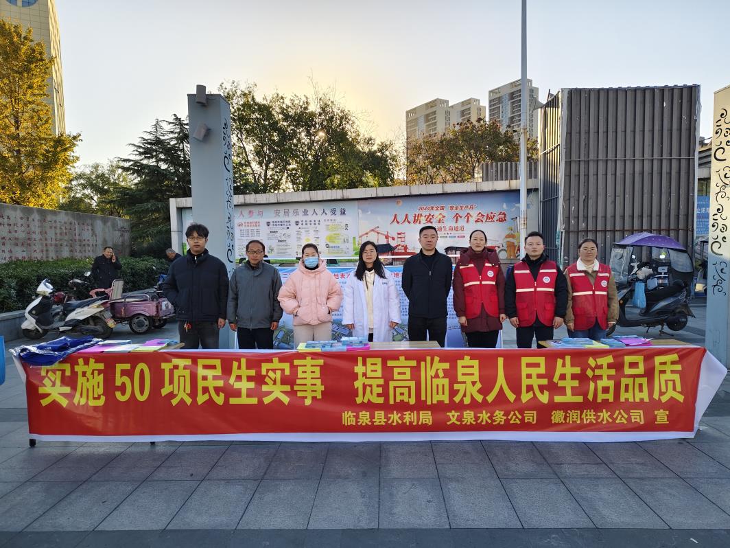 在我县全面实施50项民生实事工作的过程中,为了提升我县人民群众对于供水领域民生实事的认知度、参与度及满意度,确保各项供水举措能够深入人心、有效实施。11月26日上午,临泉徽润供水有限公司与县水利局、文泉水务等单位在姜子牙文化广场共同参与县发改委组织开展的50项民生实事集中宣传活动,广泛宣传有关供水领域民生实事。