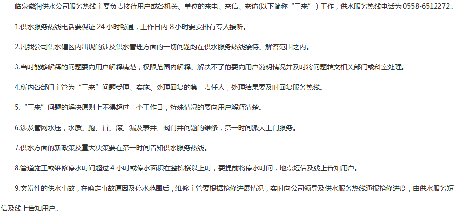 临泉徽润供水有限公司服务标准
