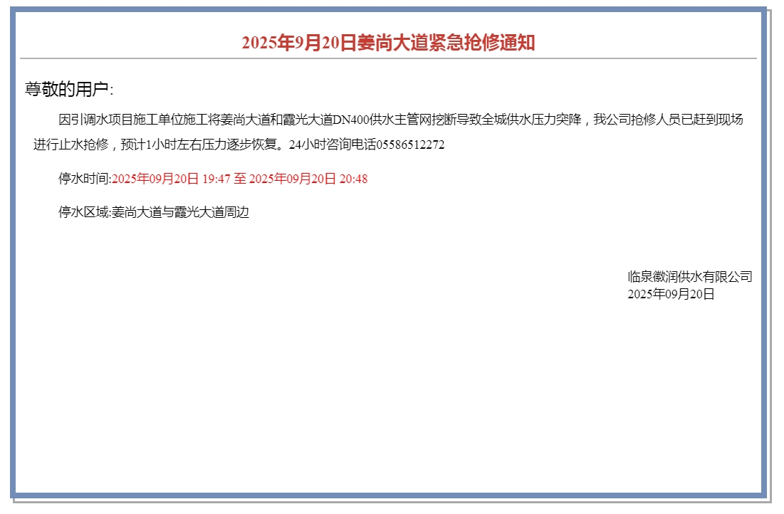 2025年9月20日抢修临时停水通知