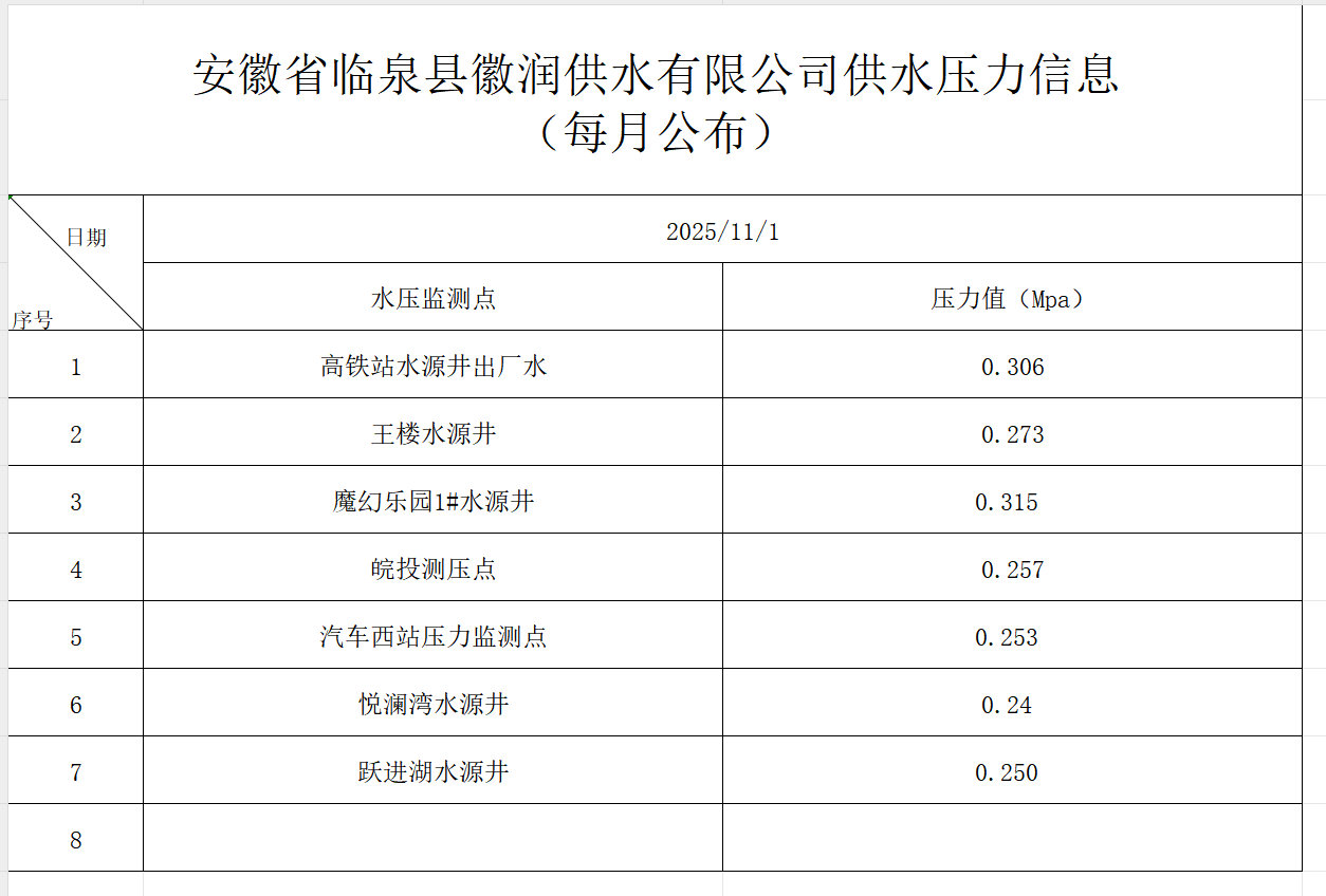 临泉徽润供水有限公司供水压力信息(2025年11月份)