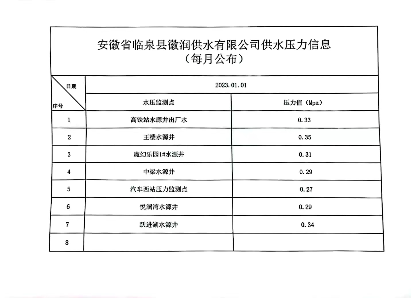 临泉徽润供水有限公司供水压力信息(2023年1月份)