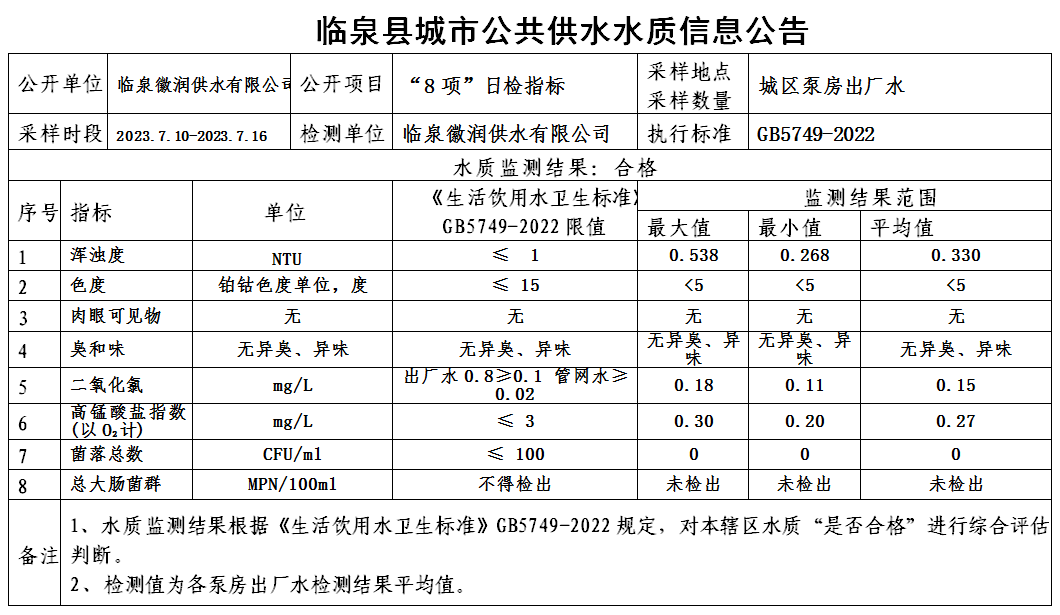 上一条: 临泉县城市公共供水水质信息公告2023年7月上半月(7项)