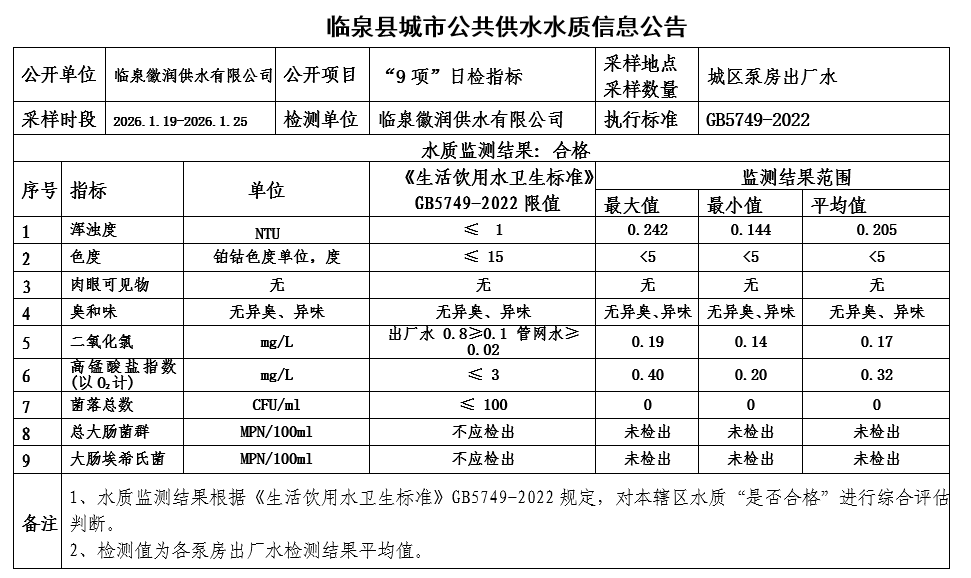下一条: 临泉县城市公共供水水质信息公告2026年1月(43项)