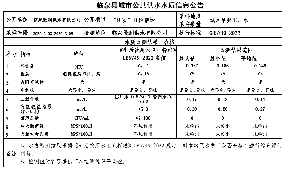 上一条: 临泉县城市公共供水水质信息公告2026年2月上半月(8项)