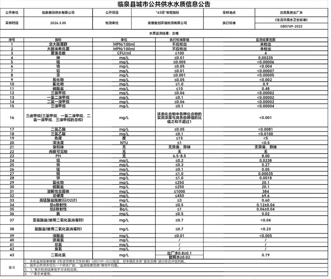 下一条: 临泉县城市公共供水水质信息公告2026年3月2日至2026年3月8日(9项)