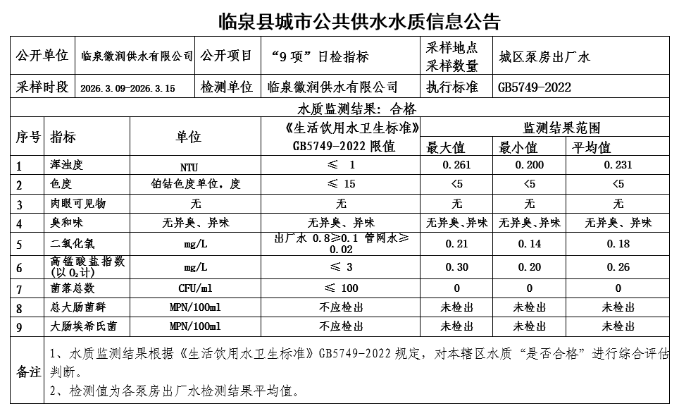 上一条: 临泉县城市公共供水水质信息公告2026年3月上半月(8项)