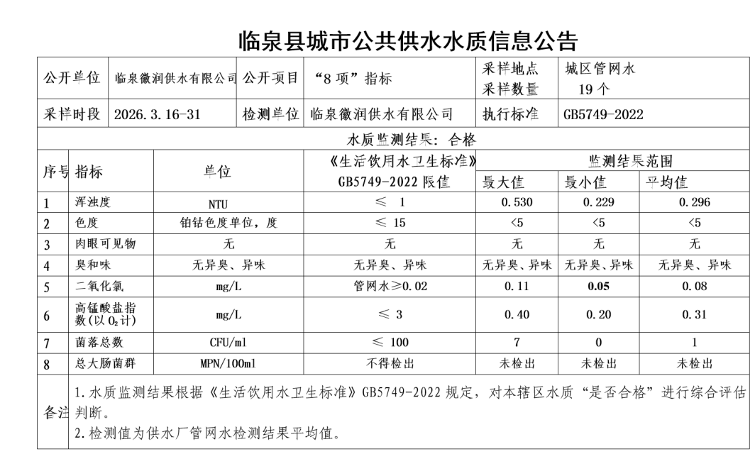 下一条: 临泉县城市公共供水水质信息公告2026年3月22日至2026年3月29日(9项)