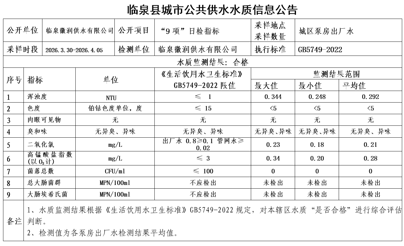 下一条: 临泉县城市公共供水水质信息公告(2026年第一季度出厂水)