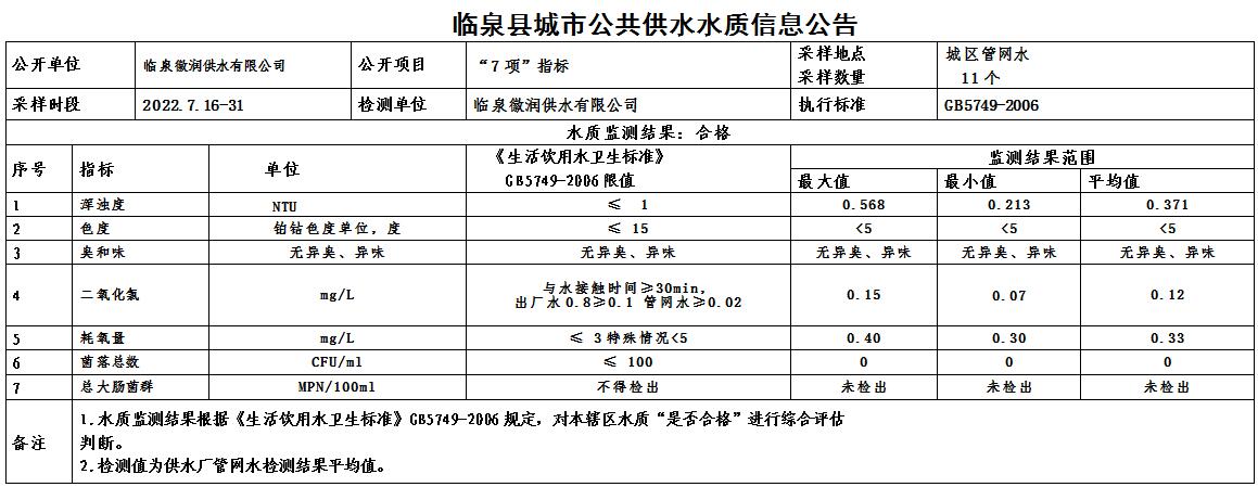 上一条: 2022年7月25日至2022年7月31日临泉县城市公共供水水质信息公告(9项)
