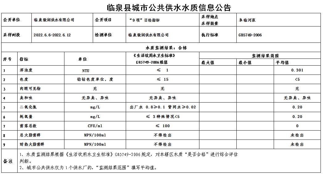 下一条: 2022年6月13日至2022年6月19日临泉县城市公共供水水质信息公告(9项)
