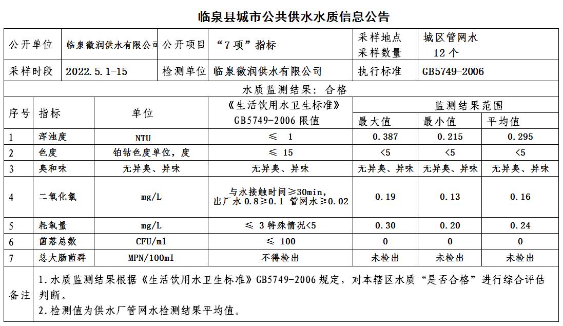 上一条: 2022年5月9日至2022年5月15日临泉县城市公共供水水质信息公告(9项)
