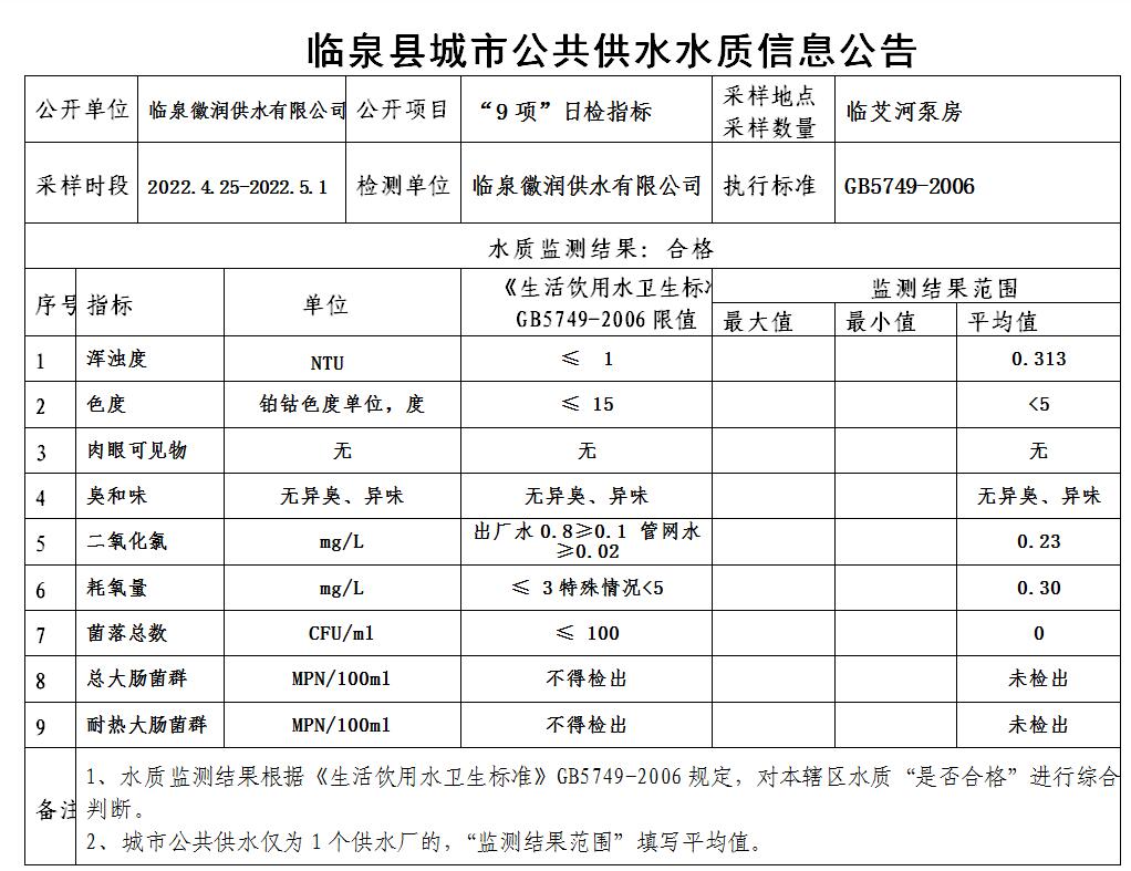 下一条: 2022年4月16日至2022年4月30日临泉县城市公共供水水质信息公告(7项)