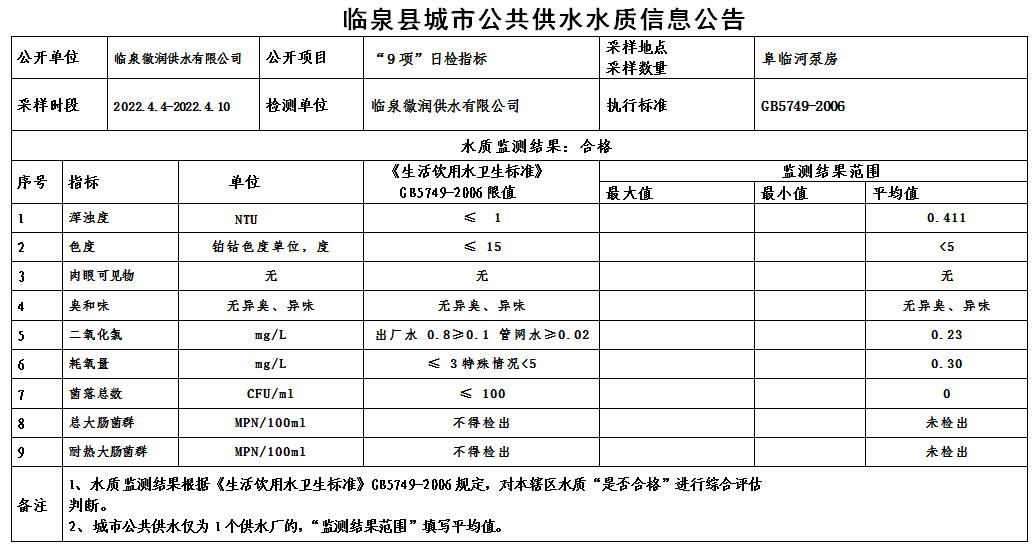 下一条: 2022年4月11日至2022年4月17日临泉县城市公共供水水质信息公告(9项)
