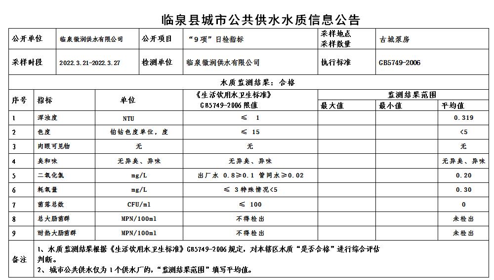 下一条: 2022年3月16日至2022年3月31日临泉县城市公共供水水质信息公告(7项)