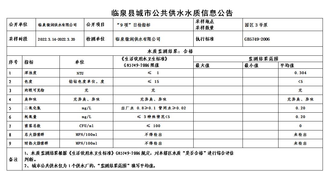 下一条: 2022年3月21日至2022年3月27日临泉县城市公共供水水质信息公告(9项)