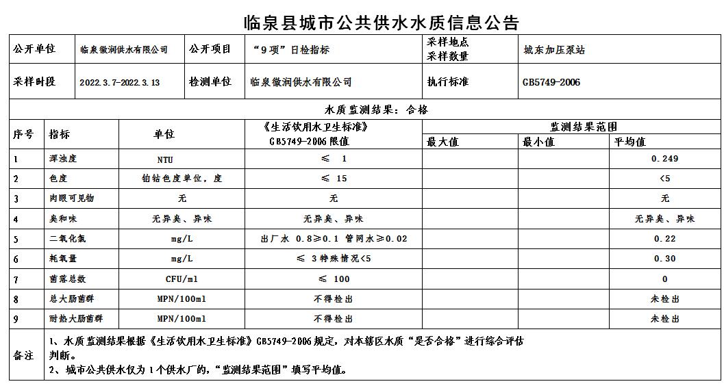 下一条: 2022年3月1日至2022年3月15日临泉县城市公共供水水质信息公告(7项)