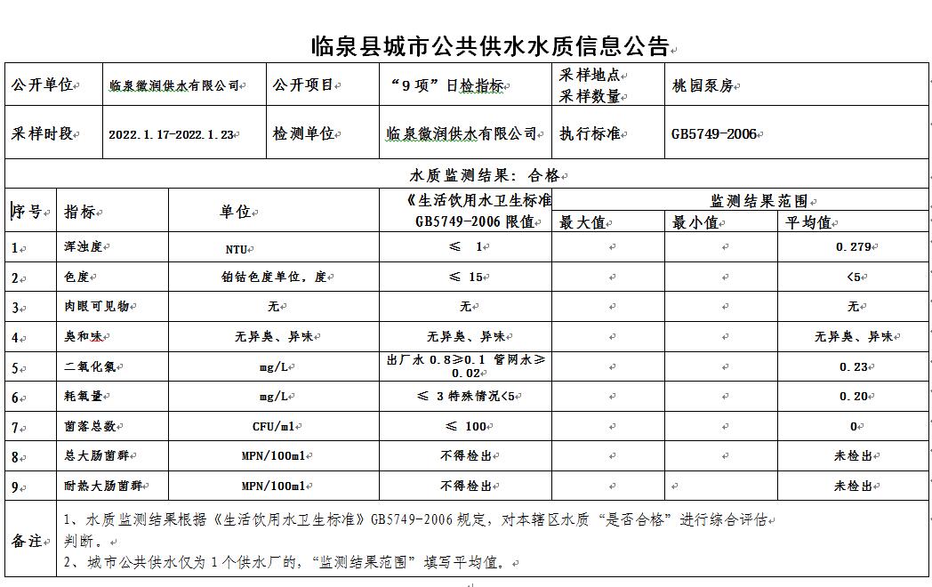 下一条: 2022年1月24日至2022年1月30日临泉县城市公共供水水质信息公告(9项)