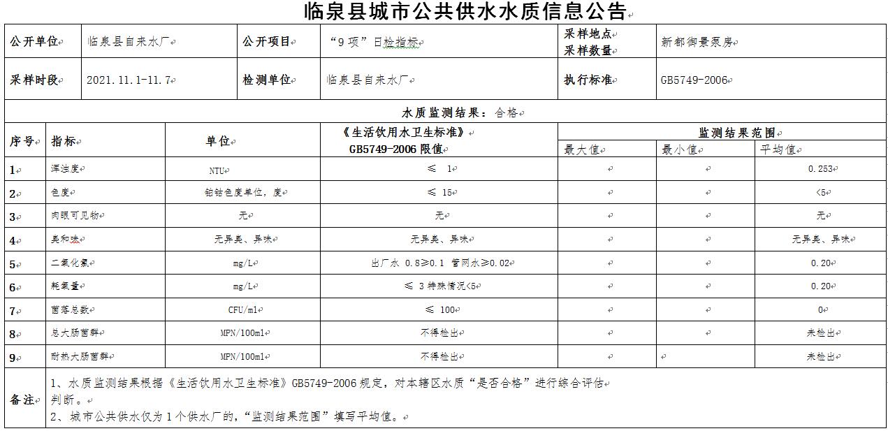 下一条: 2021年11月8日至11月14日临泉县城市公共供水水质信息公告(9项)
