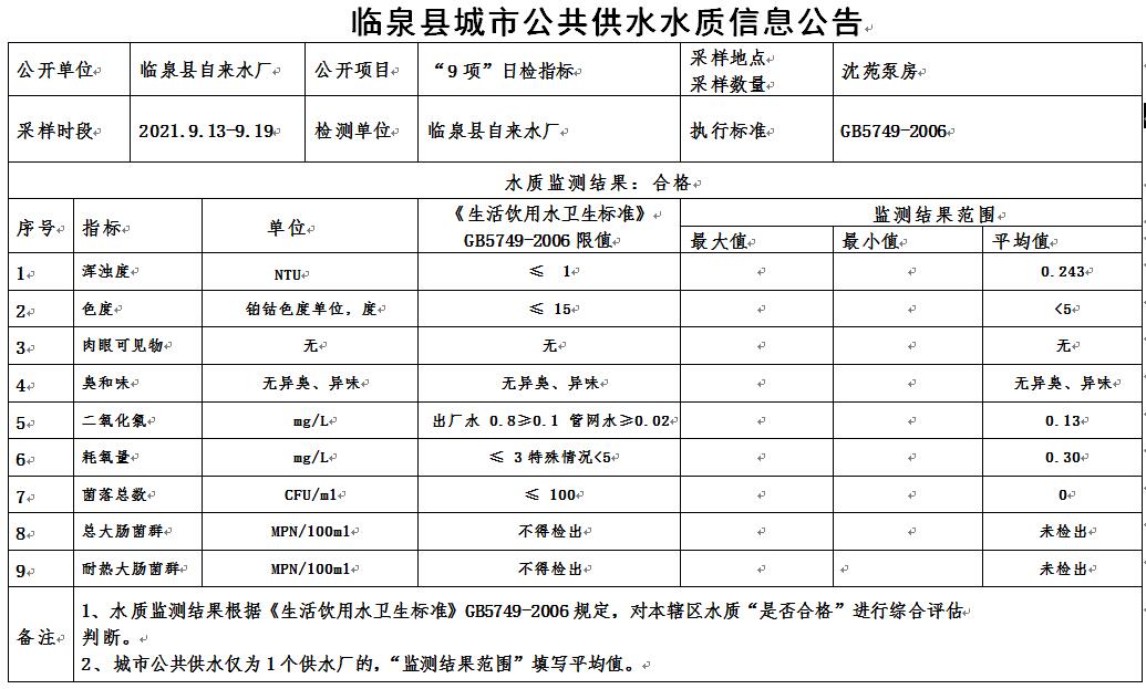 下一条: 2021年9月20日至9月26日临泉县城市公共供水水质信息公告(9项)
