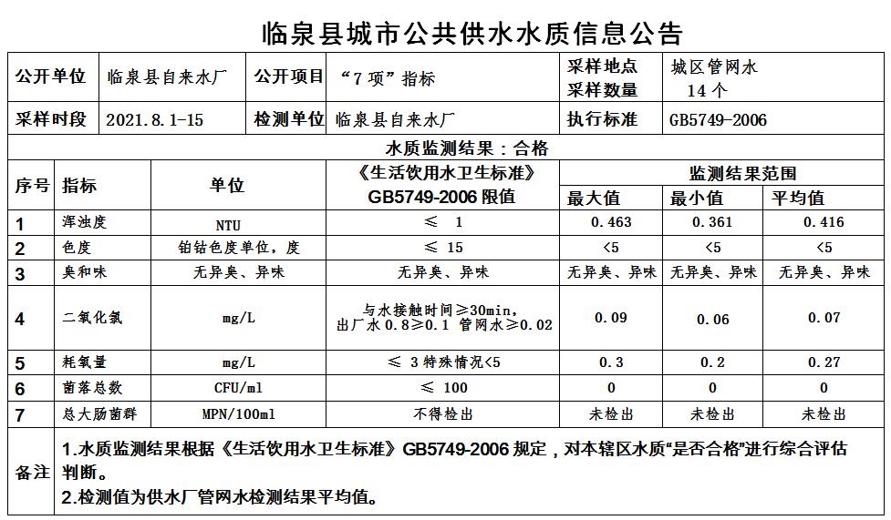 下一条: 2021年8月16日至8月22日临泉县城市公共供水水质信息公告(9项)