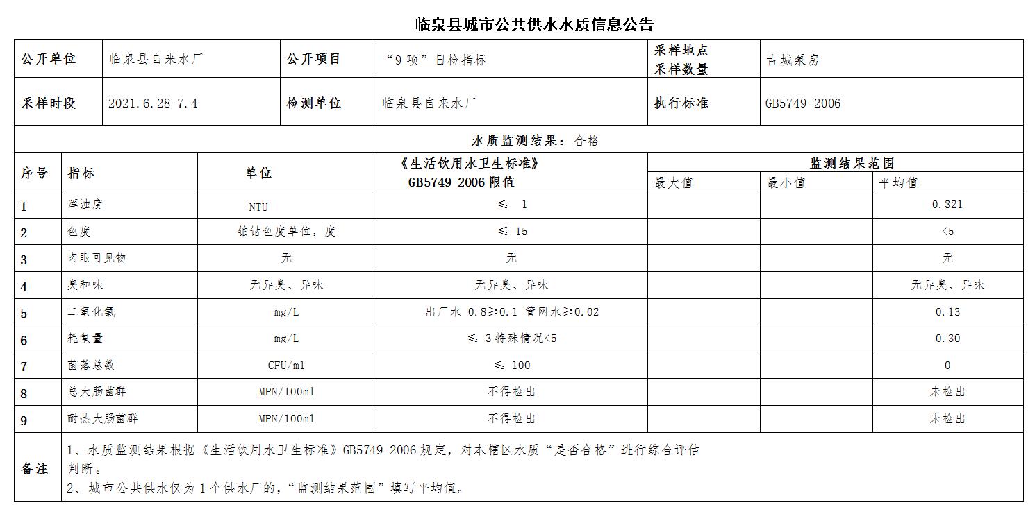 下一条: 2021年6月16日至6月30日临泉县城市公共供水水质信息公告(7项)