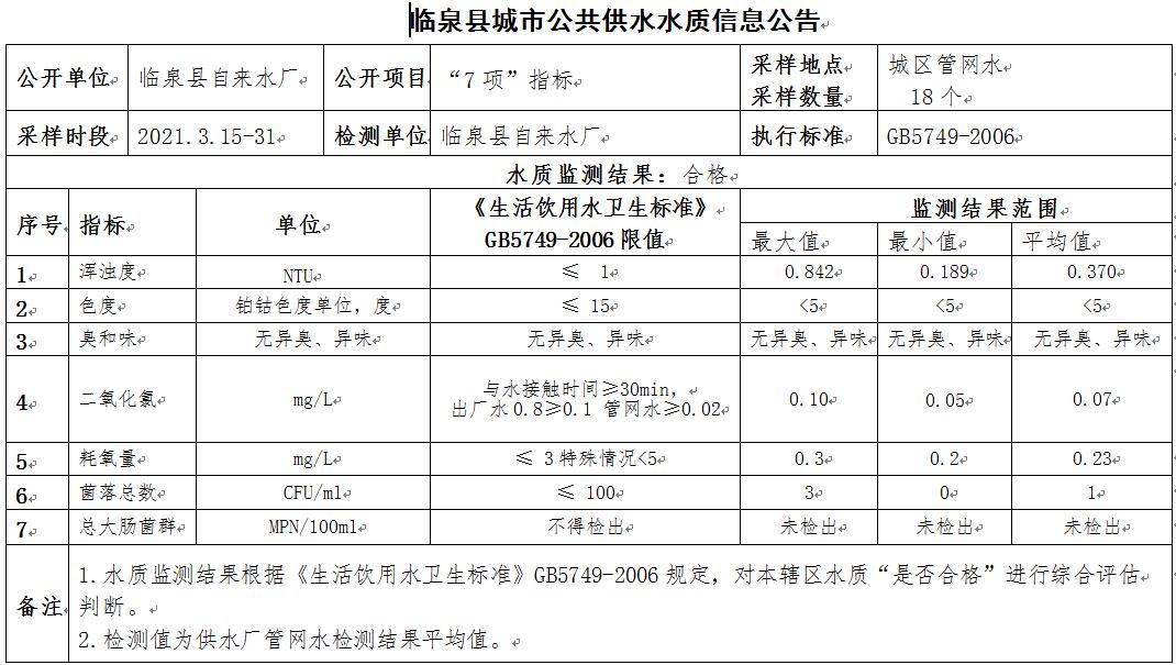 下一条: 2021年3月29日至4月4日临泉县城市公共供水水质信息公告(9项)