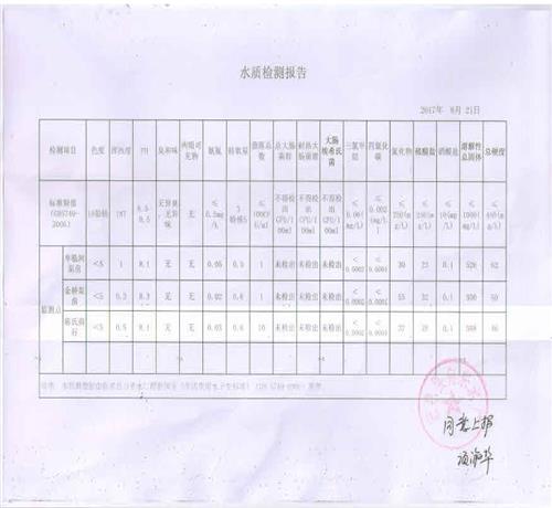 标准限值(GB5749-2006) | 15铂钴 | 1NT | 6.5-8.5 | 无异臭、无异味 | 无 | ≤0.5mg/L | 3 | ≤100CFU/ml | 不得检出CFU/100ml | 不得检出CFU/100ml | 不得检出CFU/100ml | ≤0.06(mg/L) | ≤0.002(mg/L) | ≤250(mg/L) | ≤250(mg/L) | ≤10(mg/L) | ≤1000(mg/L) | ≤450(mg/L) | ||