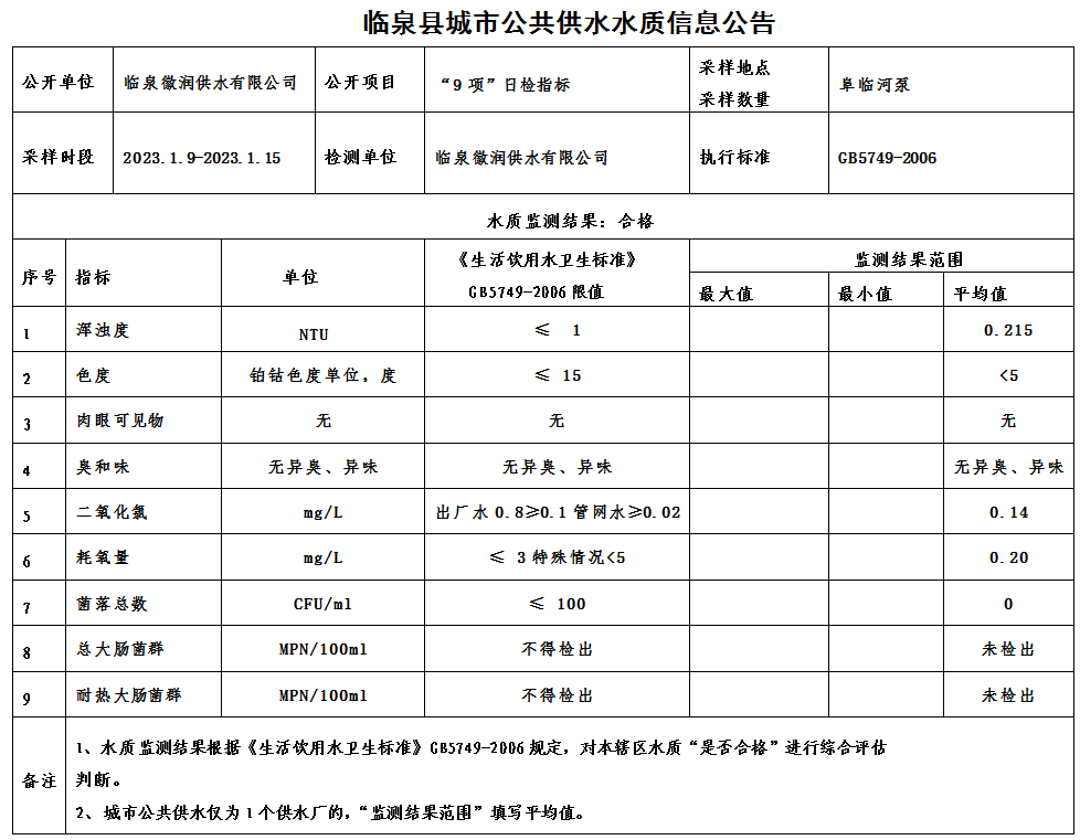 下一条: 2023年1月2日至2023年1月8日临泉县城市公共供水水质信息公告(9项)