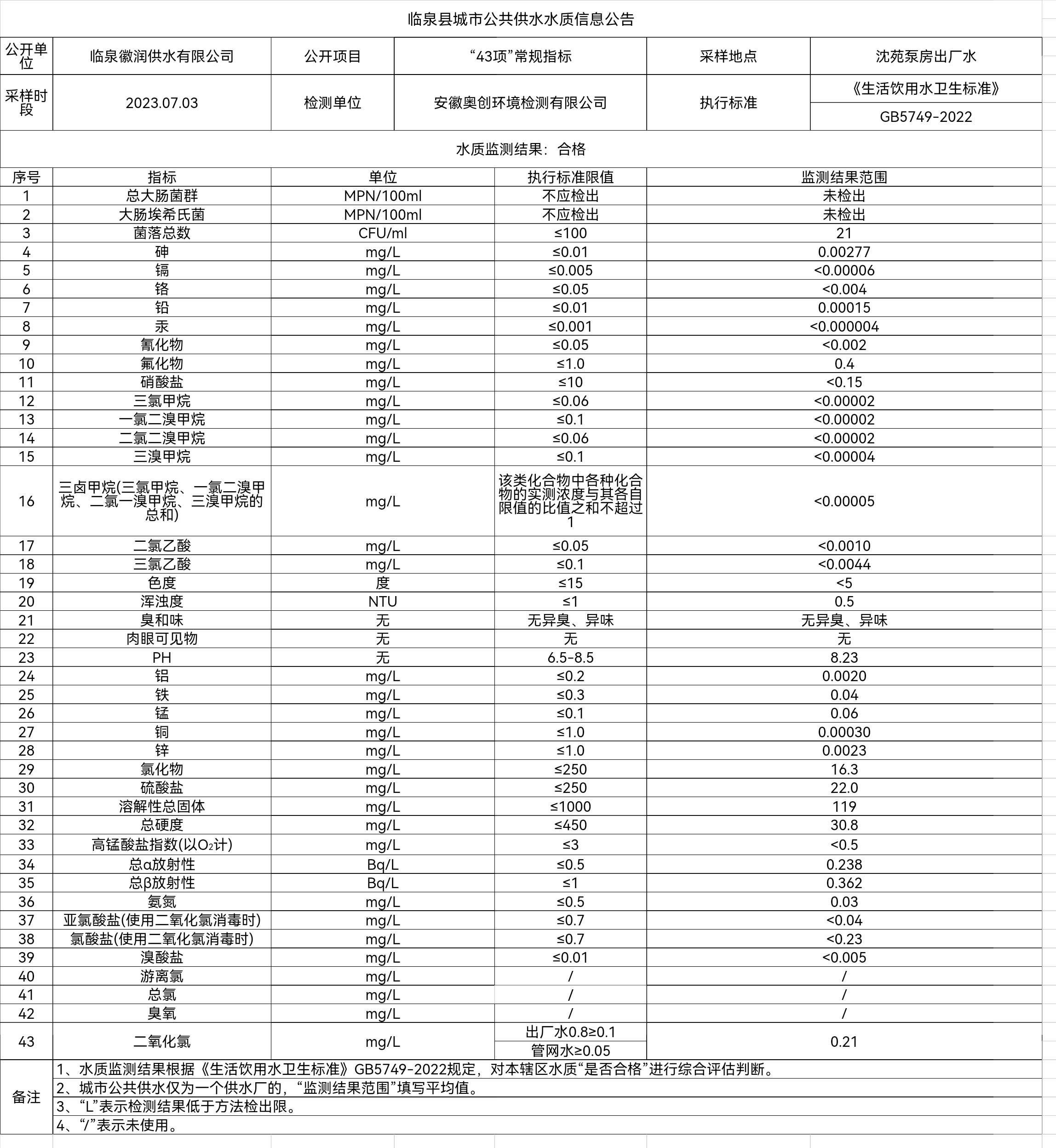 下一条: 临泉县城市公共供水水质信息公告2023年7月上半月(7项)