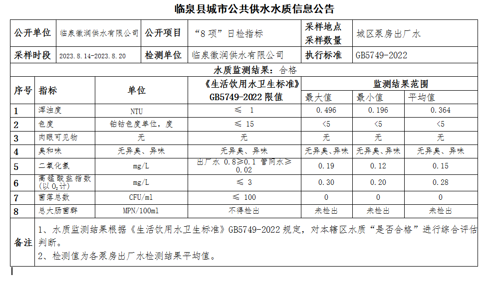 上一条: 临泉县城市公共供水水质信息公告2023年8月21日至2023年8月27日(8项)