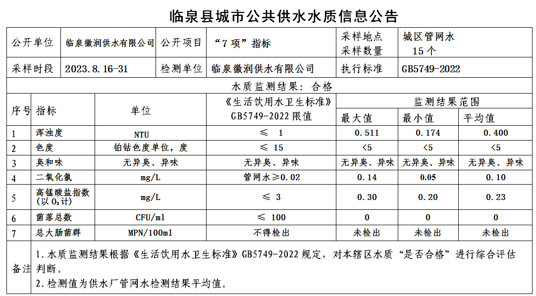 上一条: 临泉县城市公共供水水质信息公告2023年8月28日至2023年9月3日(8项)