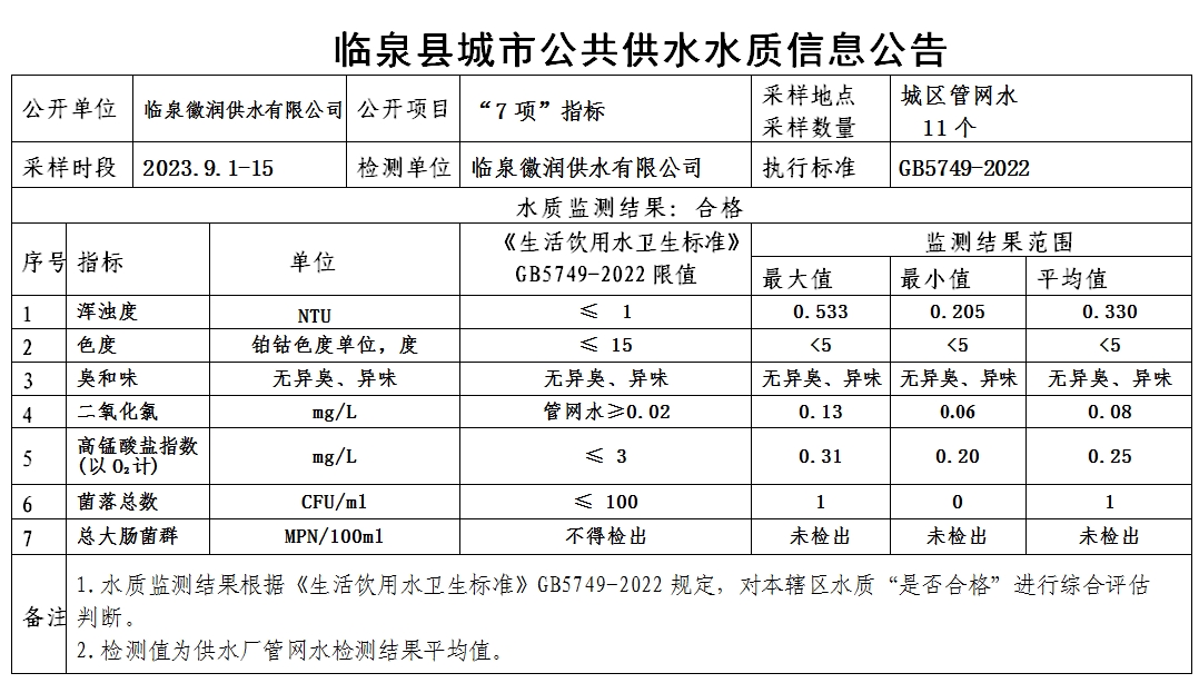 上一条: 临泉县城市公共供水水质信息公告2023年9月11日至2023年9月17日(8项)