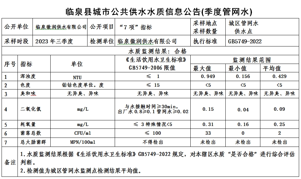 上一条: 临泉县城市公共供水水质信息公告2023年9月25日至2023年10月1日(8项)