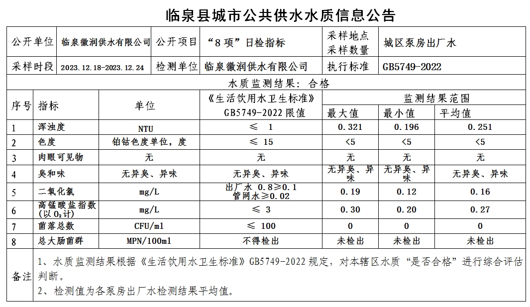 下一条: 临泉县城市公共供水水质信息公告2023年12月上半月(7项)