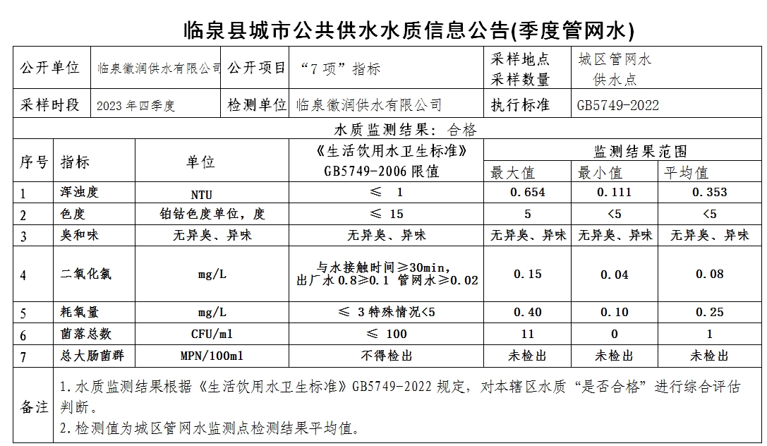 下一条: 临泉县城市公共供水水质信息公告2023年12月下半月(7项)
