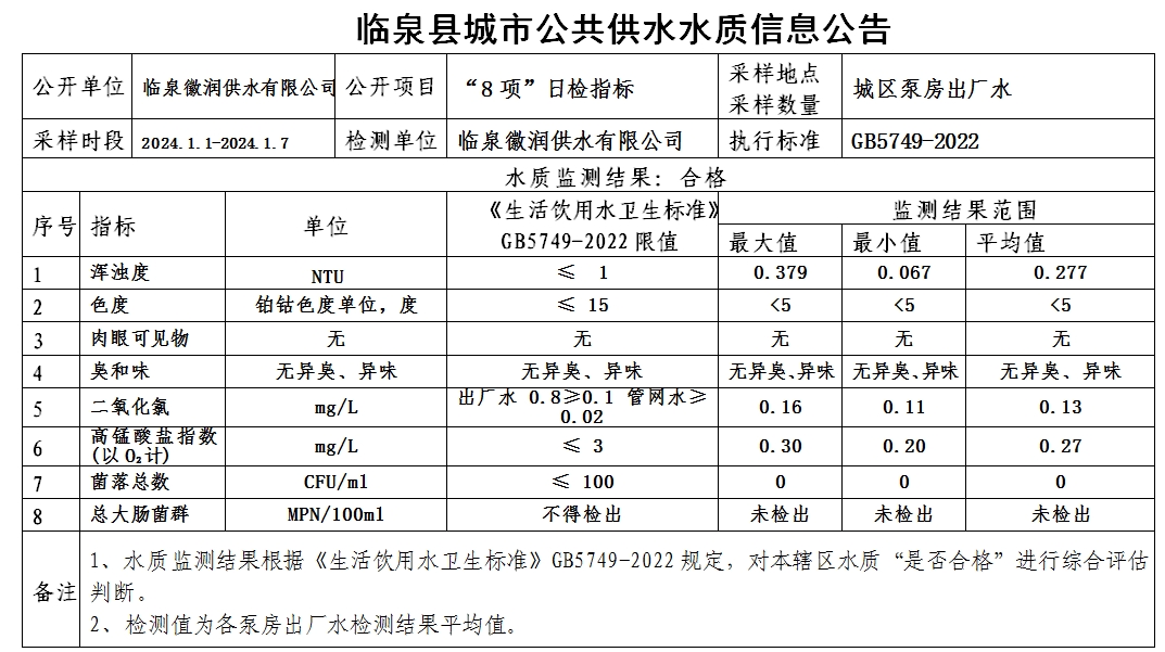 下一条: 临泉县城市公共供水水质信息公告2023年第四季度出厂水(43项)