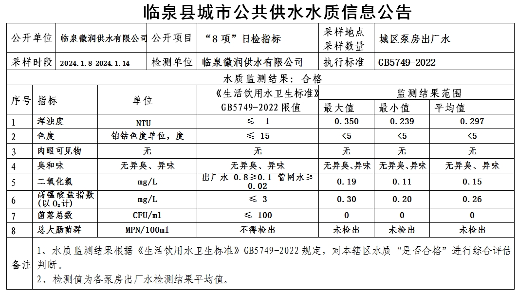 下一条: 临泉县城市公共供水水质信息公告2024年1月1日至2024年1月7日(8项)