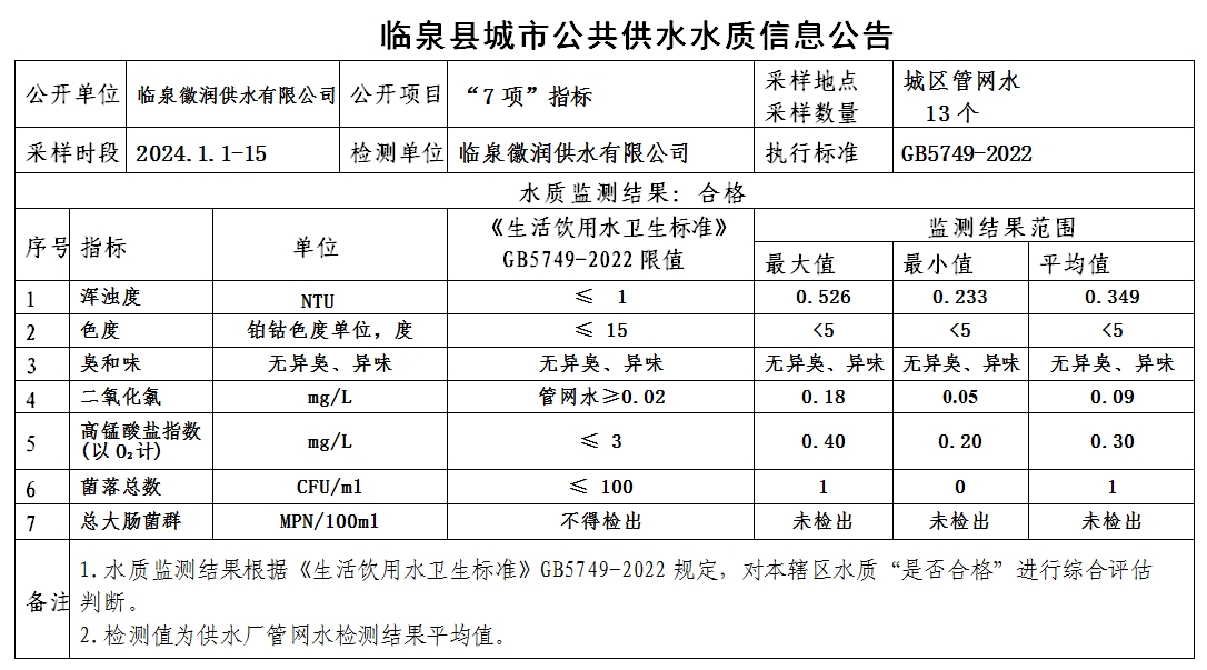 上一条: 临泉县城市公共供水水质信息公告2024年1月15日至2024年1月21日(8项)